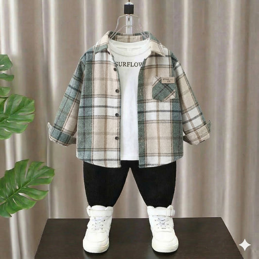 Boys 3-Piece Modern Plaid Flannel Shirt, SURFLO Graphic T-shirt, and Jogger Pants Outfit Set