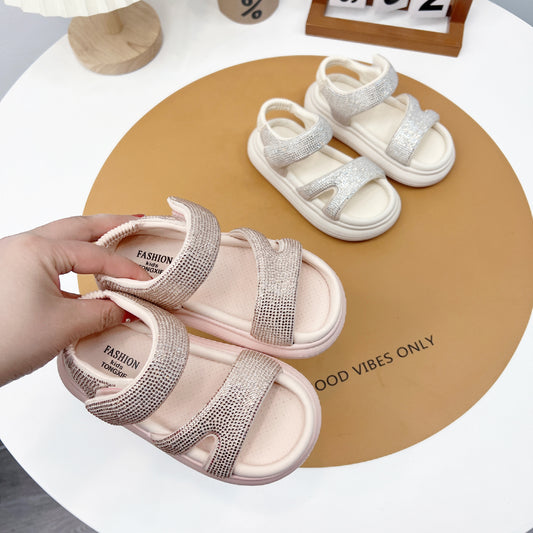 "Fashionable girls' sandals with an elegant shine and comfortable design"