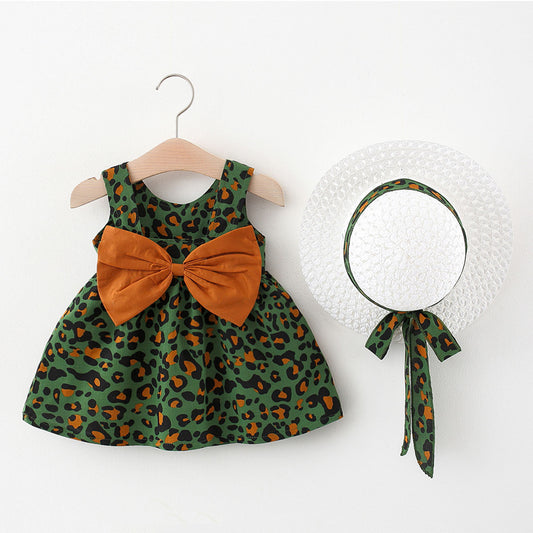 Ensemble deux pièces 100 % coton, robe léopard à col carré, sans manches, nœud papillon et chapeau