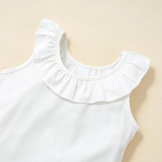 Ensemble deux pièces t-shirt blanc sans manches à volants et short en jean déchiré en dentelle