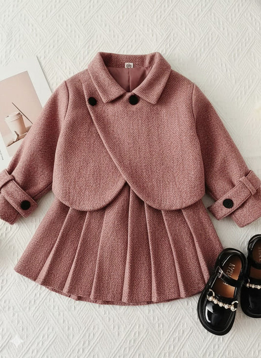 Ensemble deux pièces automne/hiver pour fille : manteau à revers en tweed décontracté et jupe plissée rétro