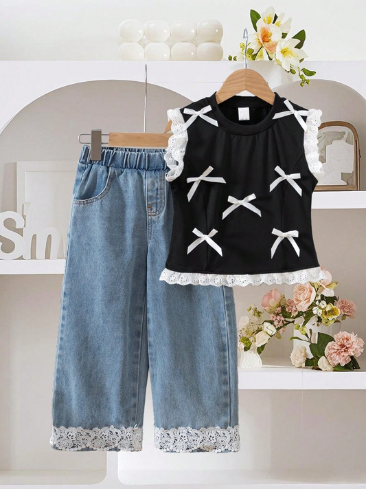 Ensemble 2 pièces d'été pour petite fille : haut à nœud et pantalon large en dentelle