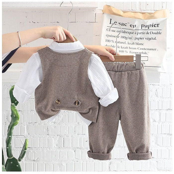 Habillez votre petit garçon d'une élégance intemporelle avec cet ensemble de cérémonie classique pour garçon. Conçue pour les grandes occasions, cette charmante tenue comprend un gilet ajusté, une chemise blanche impeccable et un pantalon assorti, le tout rehaussé d'un nœud papillon raffiné. Les tons neutres et la coupe classique créent une allure sophistiquée, idéale pour les mariages, les fêtes, les événements scolaires ou les séances photo officielles. Confortable et élégant, cet ensemble allie tradition et modernité.