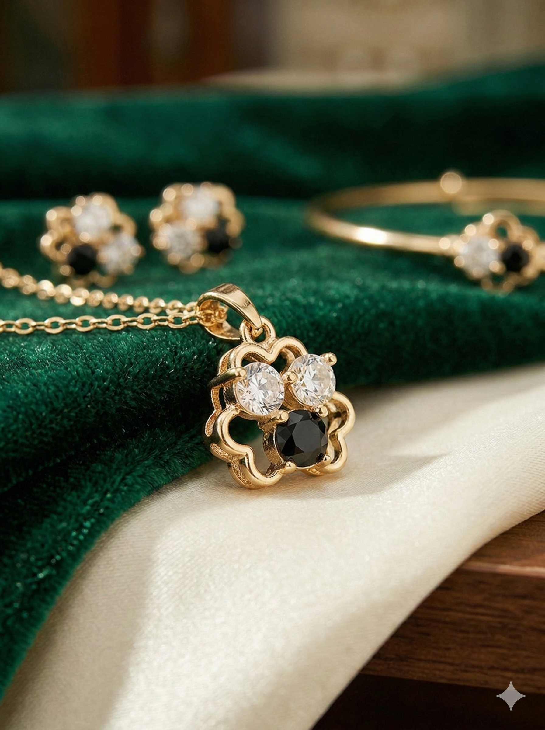 Ensemble de bijoux en or anti-ternissement en forme de trèfle à quatre feuilles – Couleur durable et résistante à l'oxydation, orné de pierres CZ noires et transparentes (ensemble de 5 pièces)