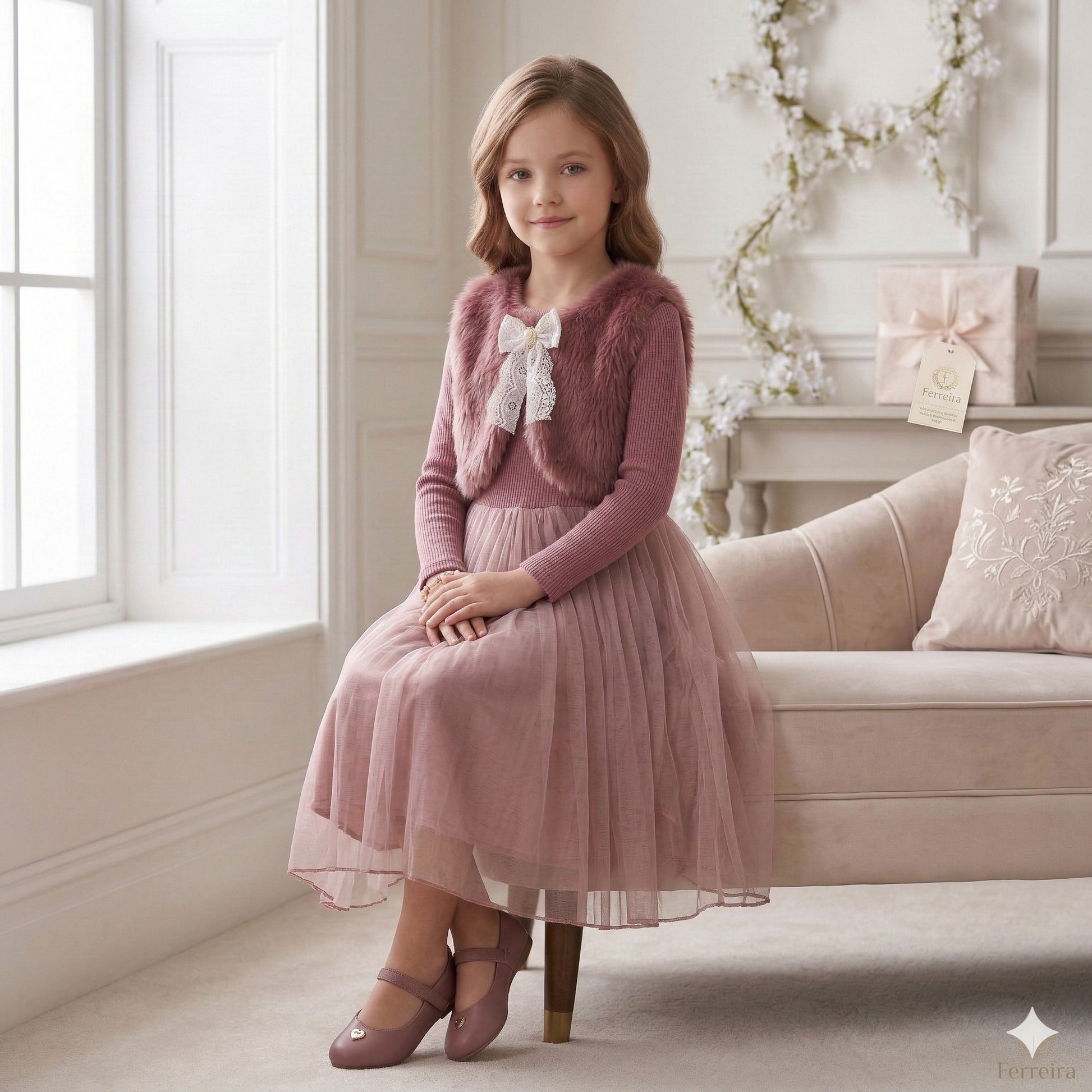 L'ensemble comprend une robe rose poudré sophistiquée, dotée d'un corsage en maille côtelée douce et d'une magnifique jupe fluide en tulle multicouche. Le gilet en fausse fourrure luxueuse inclus apporte une touche d'élégance instantanée et une allure raffinée et luxueuse.