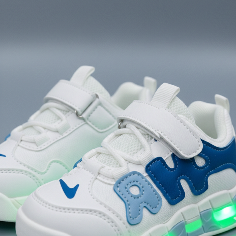These fun and sporty kids’ sneakers combine everyday comfort with eye-catching LED lights in the sole. Designed for active children, they feature a lightweight build, breathable materials, and an easy hook-and-loop strap for quick on and off. The transparent midsole lights up with every step, making walking and running more exciting while also improving visibility in low light. Available in multiple stylish color combinations to match any outfit.